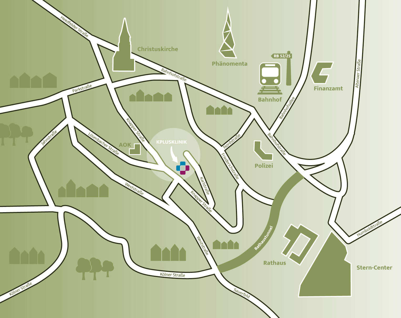 Über die A4: Fahren Sie auf die A4 Richtung Olpe bis zum Kreuz Siegen. Von dort fahren Sie auf die A 45 bis zur Ausfahrt Lüdenscheid Süd. Anschließend rechts abbiegen Richtung Lüdenscheid Zentrum. Bleiben Sie auf der L 561 in Richtung Kulturhaus. Dieses passieren Sie bis zu einer großen Kreuzung. Über die Kreuzung hinaus fahren Sie in die Weststraße und biegen dann rechts ein in die Augustastraße. Von dort aus gelangen Sie auf die Knapper Straße und fahren quasi direkt auf die KPLUSKLINIK zu.